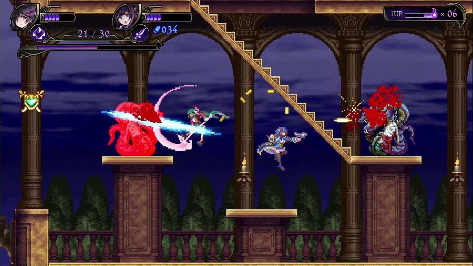 - Embark on a gothic, 2D side-scrolling, action adventure, alternating between two demon hunter sisters set on returning their school, which has turned into a demonic castle, back to normal.
